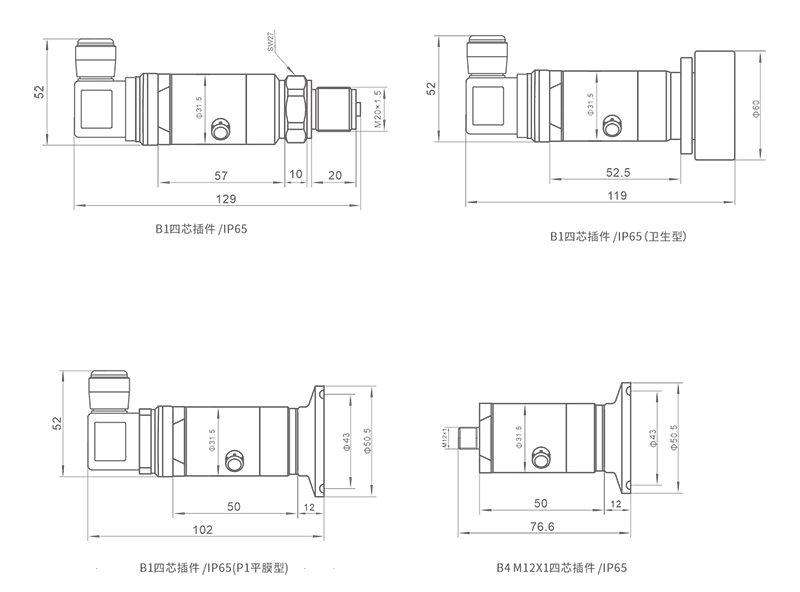 B4 M12x1四芯插件 Φ5mm PVC线长2m直插头可定制